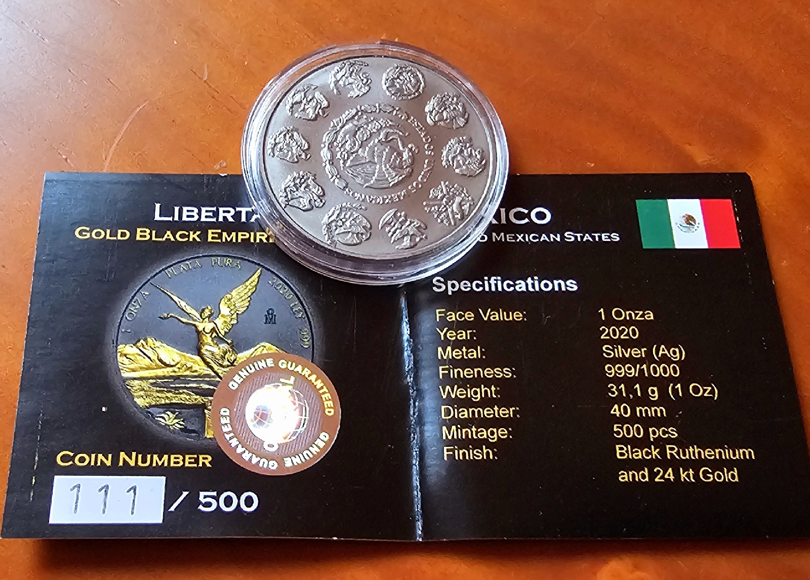 México. libertad. gold Black Empire Edition. 2020. 1 onza 2020. finish Black Ruthenium and 24 kt gold. coin number 111 of 500